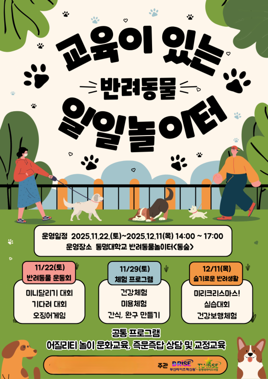 동명대학교(총장 이상천) 반려동물대학은 반려인과 반려동물이 함께 참여할 수 있는 체험형 프로그램 '교육이 있는 반려동물 일일놀이터'를 오는